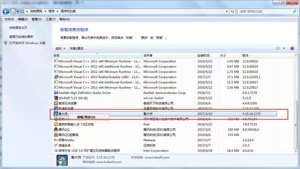 2、在卸載程序中找到魯大師右鍵卸載即可。