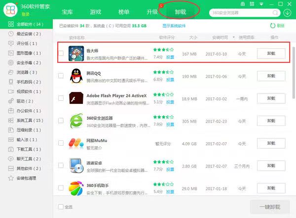 2、在軟件管家的“卸載”中找到魯大師點擊卸載即可。