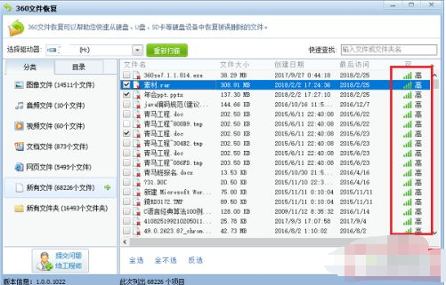 3、等待掃描完成之后,看到可以恢復的文件,可恢復性越高,恢復文件成功的概率越大,勾選要恢復的文件之后,點擊恢復選中的文件,如下圖所示: