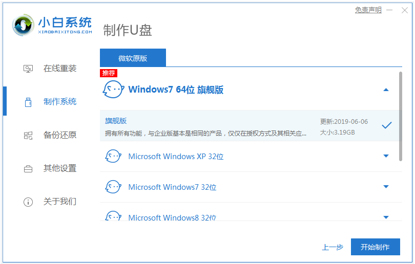 2、選擇需要安裝的系統,點擊開始制作啟動盤。