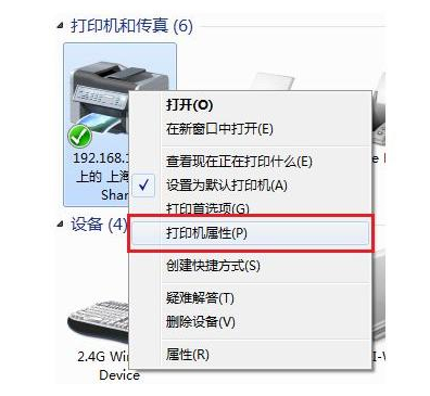 5、在打印機圖標上我們右鍵點擊,選擇打印機屬性。