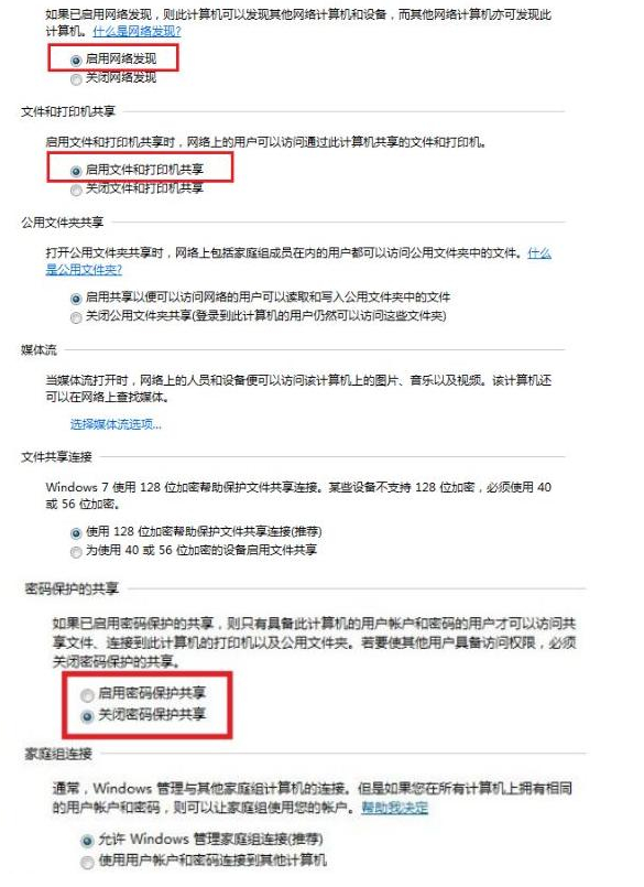 3、然后我們將啟用網絡發現、啟用文件和打印機共享、關閉密碼保護共享三個勾選上,接著點擊保存設置。