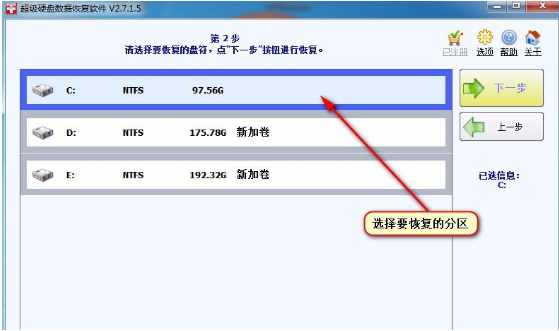 2. 選擇需要恢復的磁盤盤符,然后點擊下一步。