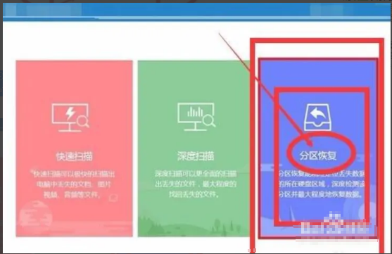 2. 進入軟件界面會看到三種選項:快速掃描、深度掃描、分區恢復選項,每個選項會有對應的工具具體描述,用戶可根據實際情況選擇合適的進行操作,一般選擇分區恢復選項。