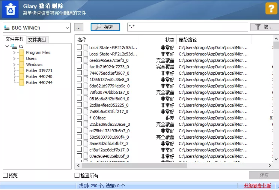 Glary Undelete 免費數據恢復軟件,對文件類型沒有限制,過濾功能你可以篩選出你指定文件名、大小、日期可完整恢復的文件。篩選功能比較強、顯示恢復狀態。但如果深度搜索需付費。