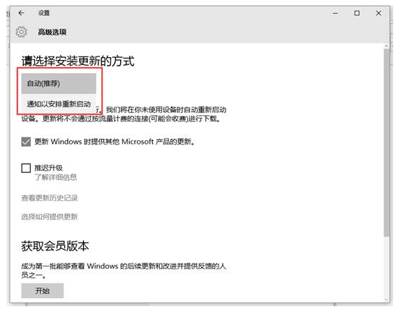 4、在“選擇安裝更新的方式中”選擇“自動(推薦)”或“通知以安排重新啟用”。但是沒有關閉選項,如果需要關閉需要關閉windows update服務,