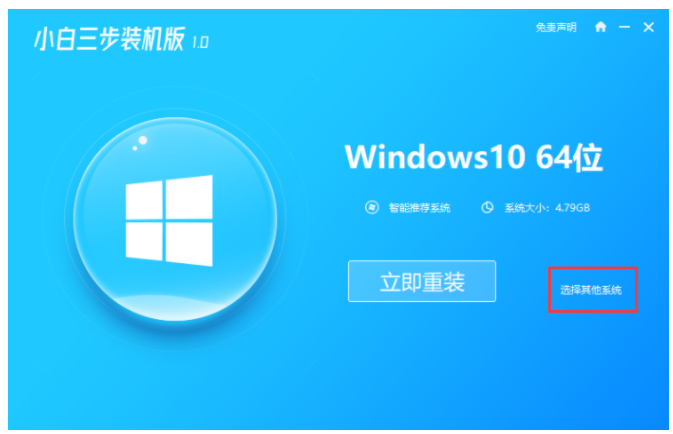 1、下載小白三步裝機版軟件并打開,選擇想要安裝的系統版本后點擊立即重裝。(以win10系統為例)。