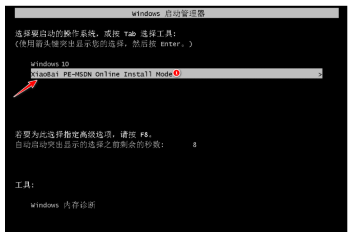 2、等待小白自動完成相關操作后選擇立即重啟,重啟后選擇 XiaoBai PE-MSDN Online Install Mode,然后按回車鍵。