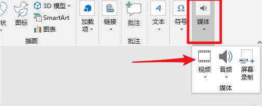 4、在插入里,找到“媒體”按鈕,選擇“視頻”