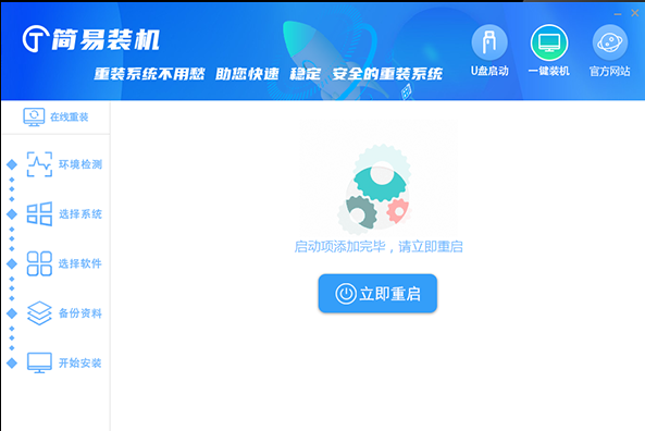 1、下載簡單裝機助手并運行,進入界面點擊開始重裝。