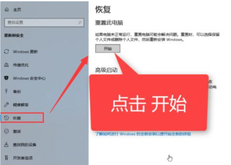 3.在左邊的選項中找到“恢復”按鈕,在右邊恢復下面找到“開始”選項,點擊它。