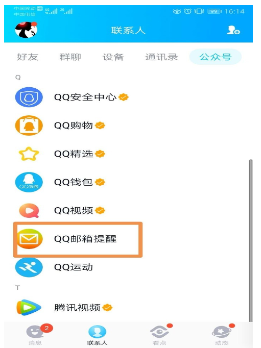 1、打開手機qq,在聯系人界面中,切換到“公眾號”版面。