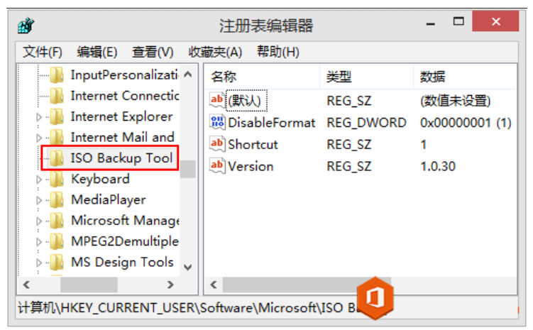 3、添加信息到注冊表之后,再次打開注冊表編輯器,定位至“HKEY_CURRENT_USER\Software\Microsoft”,就會看到一個新增的“ISO Backup Tool”文件夾,該項下新建了三個值,分別是:Version、Shortcut、DisableFormat。