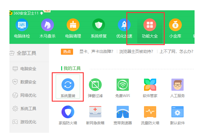 1、下載并打開360安全衛士,換到“功能”選項卡,找到并點擊“系統重新安裝”。