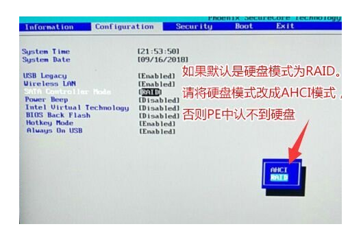 3、在【Configuration】當中,點擊【SATA Controller Mode】修改為【ahci】模式。
