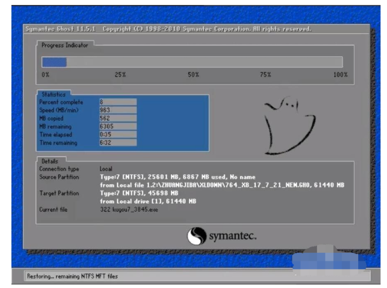 6、進入Ghost還原過程,耐心等待過程完成即可。