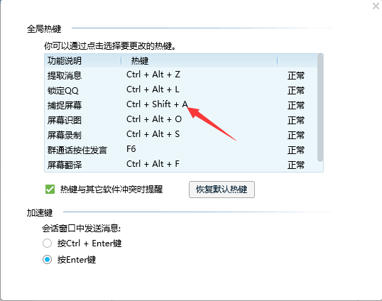 注意事項:在為系統快捷截圖定制快捷鍵不是隨便哪個鍵都能設置的,要避免同其他軟件(尤其是QQ、輸入法)的快捷鍵組合發生沖突。例如,如果選擇【ctrl+alt+Z】組合就會跟QQ的快捷鍵組合發生沖突了,不能正常使用。設置成功以后,直接按住【ctrl+alt+Z】即可成功呼出快捷截屏。
