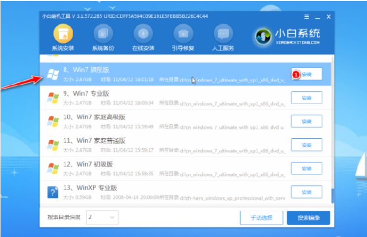 步驟六:PE內,先打開小白裝機工具選擇win7系統進行安裝,目標分區選擇C盤即可。