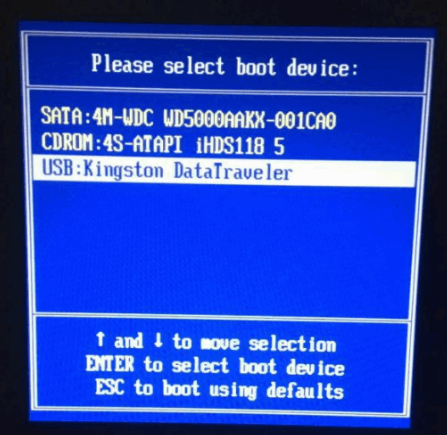 步驟六:插入啟動盤進電腦重啟,按F12啟動快捷鍵進入到啟動項的頁面,選項“USB'進入即可。