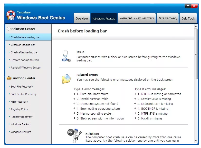 3、一旦 PC 從 CD/USB 啟動,就會出現一個軟件界面。從左側的菜單中選擇問題的原因。按照屏幕上的說明進行操作。您的問題將很容易解決。