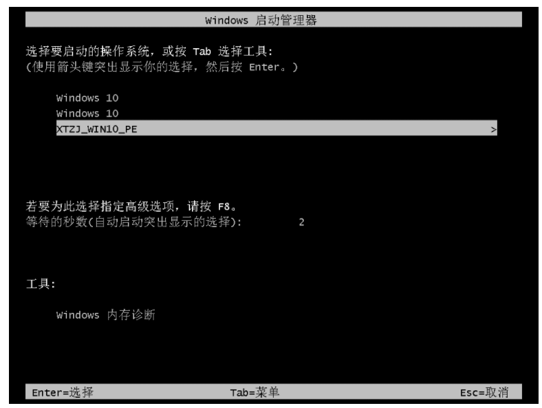 5、重啟系統后,選擇【XTZJ_WIN10_PE】按回車。