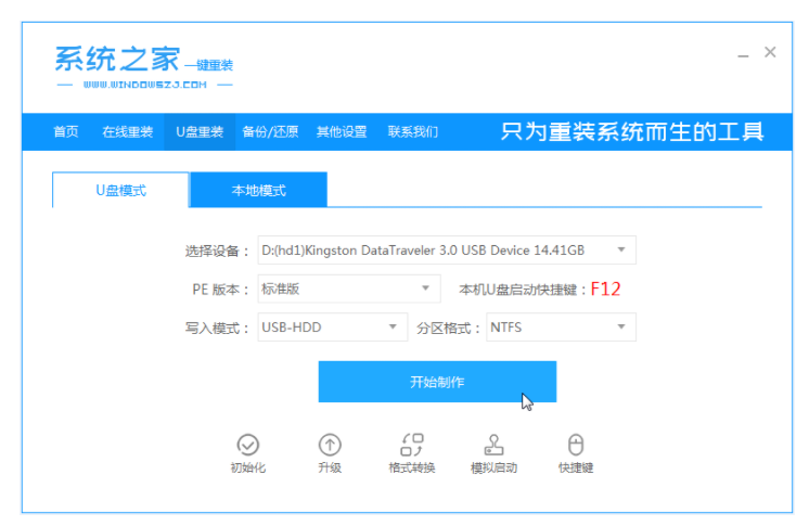 2、等待軟件自動檢測U盤,完成后點擊開始制作。