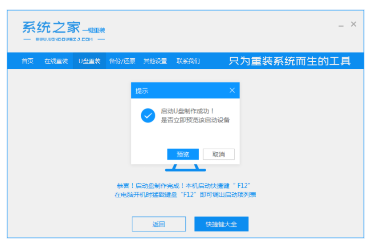 4、等待U盤制作成功,預覽啟動快捷鍵后,返回重啟。