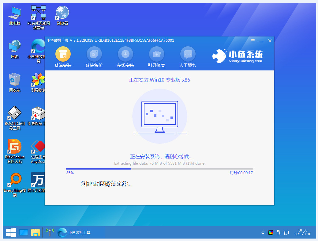 6、重啟后進入pe系統中,軟件會繼續安裝win10系統。