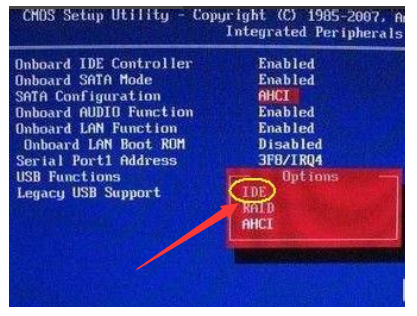 開機后不停的按下F12進入bios界面找到“Into grated peripherals”,隨后將“SATA Configuration”的值改為IDE。