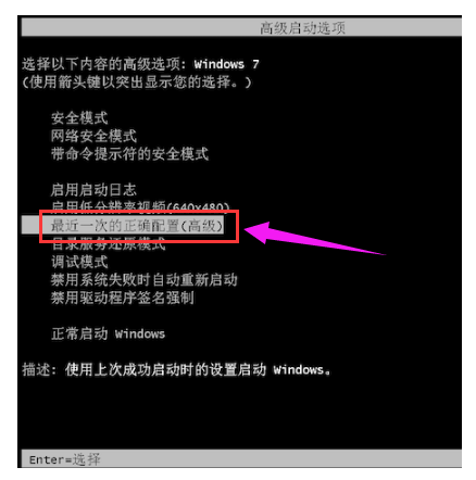 2.要修復0x0000008e藍屏代碼,您可以首先嘗試啟動進入安全模式菜單(開機后快速間斷的敲擊F8熱鍵),隨后選擇“最后正確的配置”以啟動。