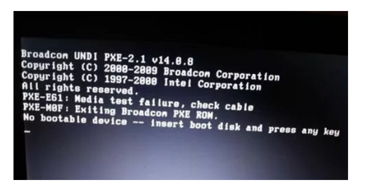 這是因為電腦找不到啟動設備導致的。打開機箱蓋看一下硬盤的連接線是否正常,若都正常則進入BIOS設置界面,把第一啟動項設置為硬盤啟動即可。