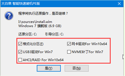 步驟六:大白菜一鍵還原窗口出現以后,建議你們勾選“網卡驅動”以及“USB驅動”復選框,然后點擊“是”進入下一步。