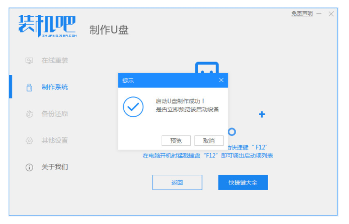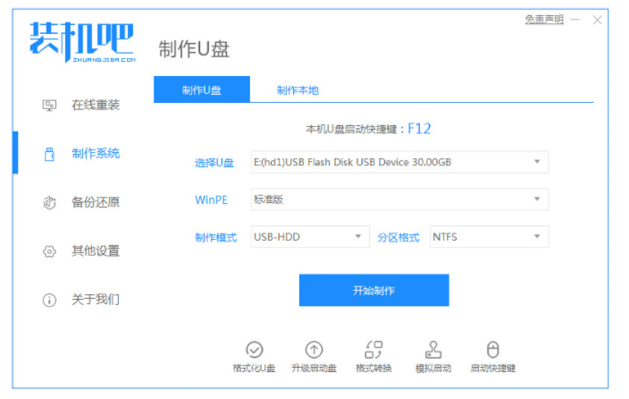 1、下載一個裝機吧一鍵重裝系統軟件并打開。插入U盤。選擇制作系統,在制作U盤中選擇您的U盤,點擊開始制作。