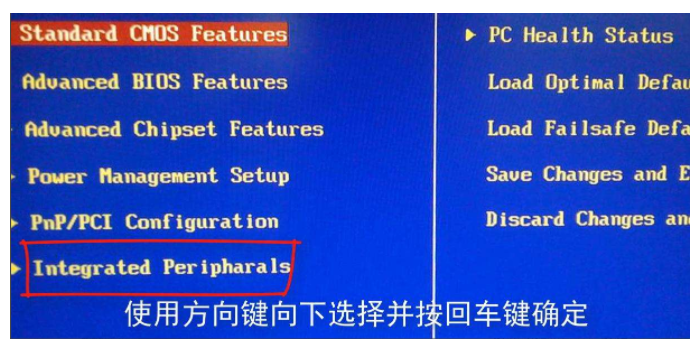 2、進到Bios中,通過鍵盤方向鍵向下選擇“IntegratedPeriphharals”并按回車鍵確定。