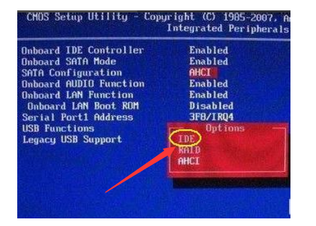 1、在BIOS界面內,進入“Into grated peripherals”選項里把“SATA Configuration”項的值改成IDE。