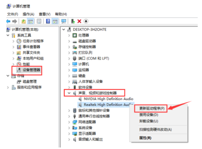 2、點擊“設備管理器”,然后展開“聲音,視頻和游戲控制器”,右鍵點擊聲卡驅動程序菜單欄,選擇“更新驅動程序”。