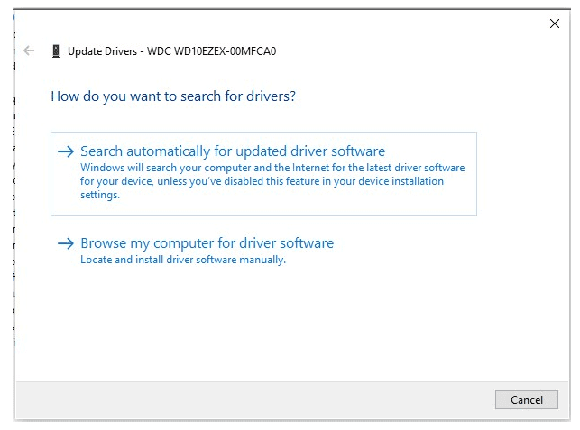 5、如果您選擇更新驅動程序,您需要手動瀏覽下載的設備驅動程序更新或選擇“自動搜索”讓系統查找并安裝最新的設備驅動程序。然后訪問硬盤制造商的支持網站,下載并安裝最新的設備驅動程序。