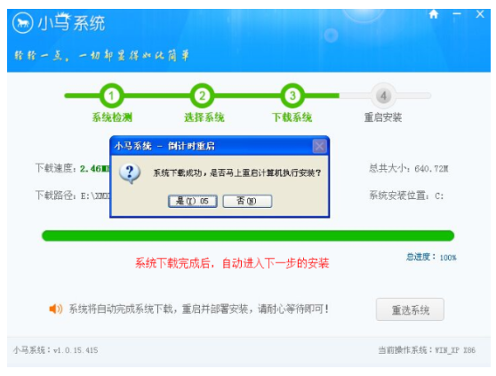 5、等待系統下載完成后會彈出一個“倒計時重啟”窗口,點擊“是”。