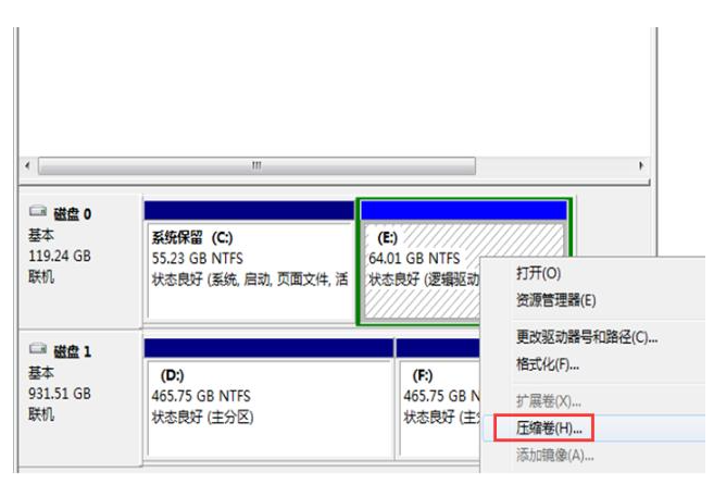 步驟四:鼠標右擊c盤臨近的磁盤,這是e盤,選擇卷壓縮。