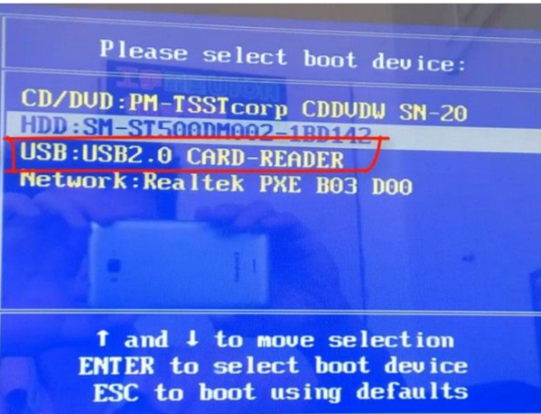 步驟六:我們把u盤插入要裝系統的電腦,開機按熱鍵進入啟動項,選擇USB項,按回車鍵。