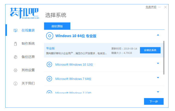 1、打開裝機吧一鍵重裝系統,選擇想要的系統,點擊【下一步】。