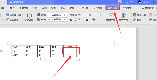 1、打開插入了表格的Word文檔,選擇需要計算平均值的區域,然后在菜單欄中點擊【表格工具】選項。