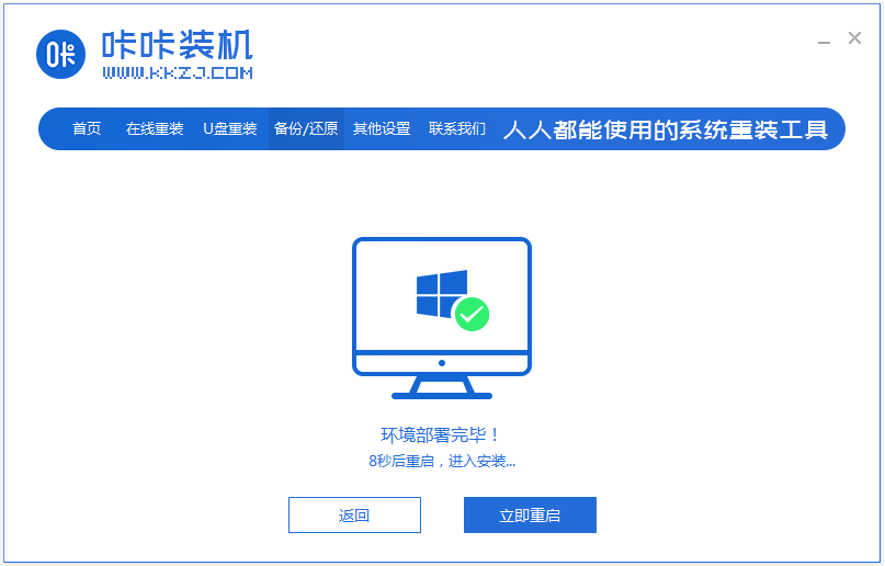 1、首先自行在msdn上下載好需要的iso系統鏡像保存在電腦非系統盤上,這里以win10為例。然后下載安裝咔咔裝機一鍵重裝系統軟件打開,單擊[備份還原]。