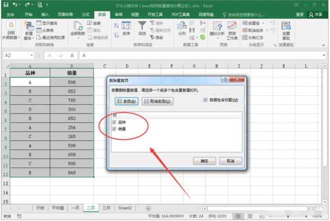 3、要注意的是,刪除重復項前需要進行設置,選中識別重復項的“列”,比如這里需要刪除“品種”和“銷量”都一樣的數據,那就都選中這兩列。
