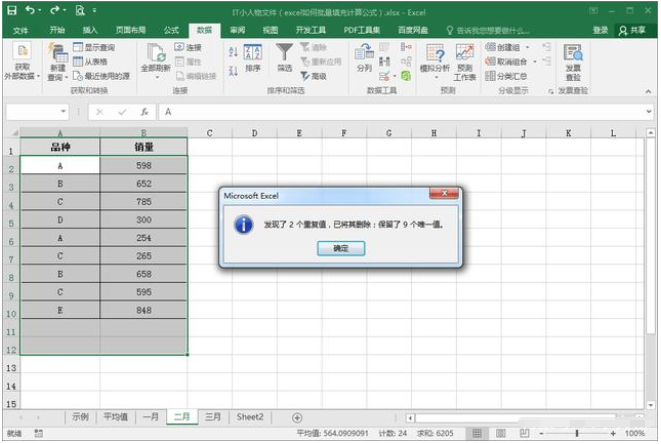 4、確定后就會刪除重復項了,并提示刪除了多少個記錄。