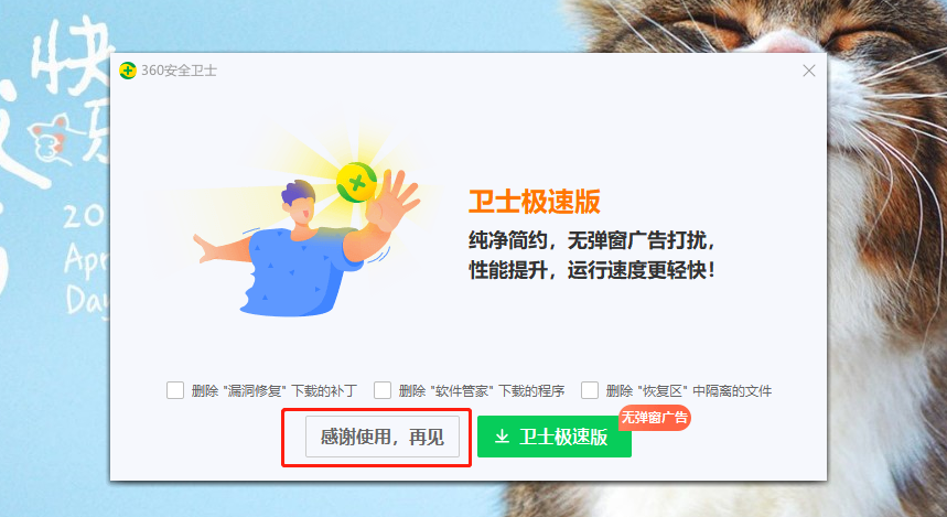 6、選擇感謝使用,再見。這時可考慮重啟電腦,幫助徹底卸載360安全衛士。
