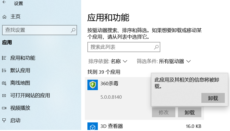 7、如果電腦還有360殺毒的話,同樣的方法:打開開始菜單——設置——應用,在應用和功能中找到360殺毒程序,選中后點擊卸載。