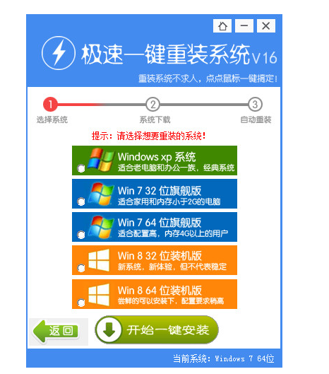 1、下載極速一鍵重裝系統,點擊開始重裝系統。