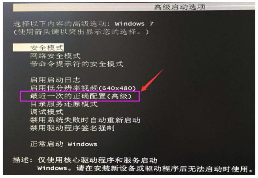 2.我們在開機的時候不斷按鍵盤上的F8鍵,選擇最近一次的正確配置(高級),隨后電腦就會恢復上一次開機時的狀態,或者同在高級啟動選項界面,選擇安全模式,即可成功進入電腦系統。