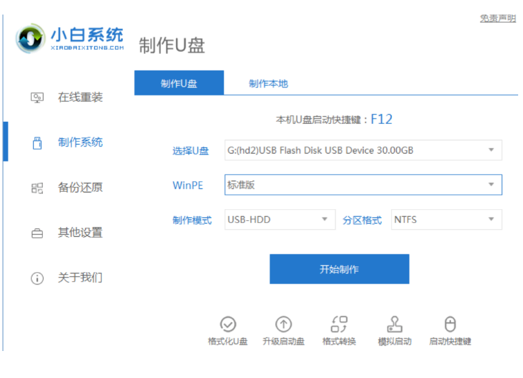 1、下載安裝小白一鍵重裝系統工具并打開,插入一個8g以上的空白u盤,點擊開始制作。